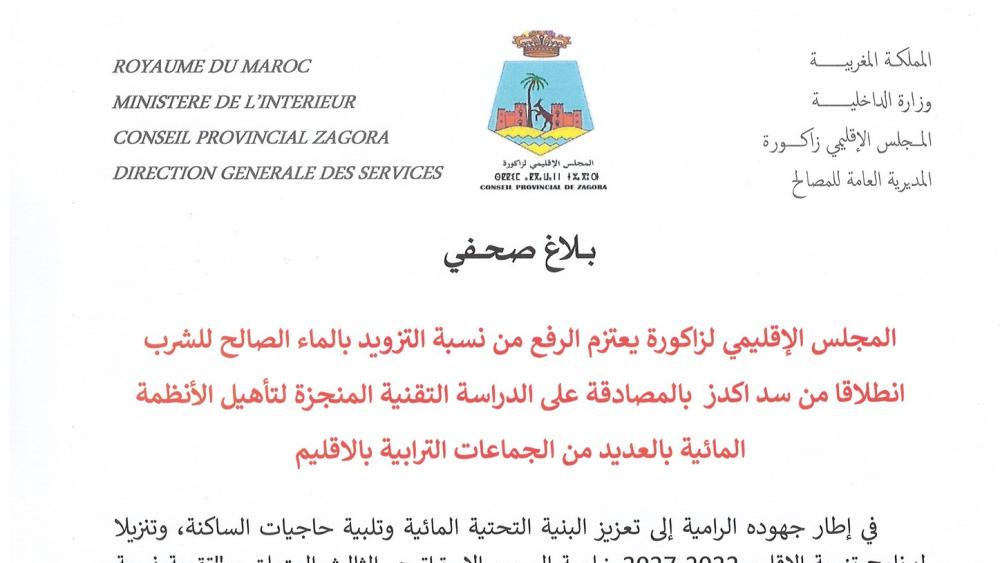 المجلس الإقليمي لزاكورة يعتزم الرفع من نسبة التزويد بالماء الصالح للشرب انطلاقا من سد اكدز بالمصادقة على الدراسة التقنية المنجزة لتأهيل الأنظمة المائية بالعديد من الجماعات الترابية بالاقليم. ...