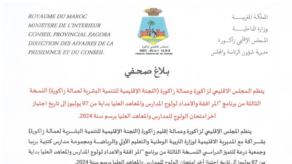 ينظم المجلس الاقليمي لزاكورة وعمالة زاكورة (اللجنة الإقليمية للتنمية البشرية لعمالة زاكورة) النسخة الثالثة من برنامج المرافقة والاعداد لولوج المدارس والمعاهد العليا بداية من 07 يوليوز الى تاريخ اجتياز آخر امتحان الولوج للمدارس والمعاهد العليا برسم سنة 2024. ...