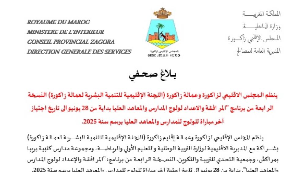 ينظم المجلس الاقليمي لزاكورة وعمالة زاكورة (اللجنة الإقليمية للتنمية البشرية لعمالة زاكورة) النسخة الرابعة من برنامج "المرافقة والاعداد لولوج المدارس والمعاهد العليا بداية من 28 يونيو الى تاريخ اجتياز آخر مباراة للولوج للمدارس والمعاهد العليا برسم سنة 2025. ...