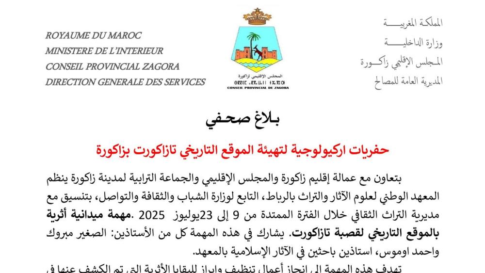 بتعاون مع عمالة إقليم زاكورة والمجلس الإقليمي والجماعة الترابية لمدينة زاكورة ينظم المعهد الوطني لعلوم الآثار والتراث بالرباط، التابع لوزارة الشباب والثقافة والتواصل، بتنسيق مع مديرية التراث الثقافي خلال الفترة الممتدة من 9 إلى 23 يوليوز 2025 مهمة ميدانية أثرية بالموقع التاريخي لقصبة تازاكورت يشارك في هذه المهمة كل من الأستاذين: الصغير مبروك واحمد اوموس استاذين باحثين في الآثار الإسلامية بالمعهد. ...