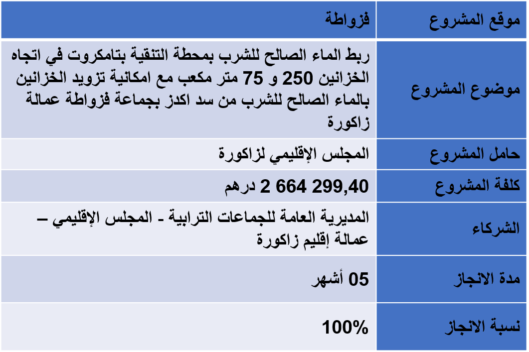 ربط الماء الصالح للشرب بمحطة التنقية بتامكروت في اتجاه الخزانين 250 و 75 متر مكعب مع امكانية تزويد الخزانين بالماء الصالح للشرب من سد اكدز بجماعة فزواطة عمالة زاكورة